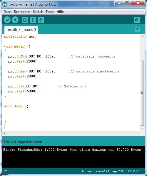 - Wenn die nxc2arduino-Bibliothek im Programmverzeichnis installiert ist, dann ist das Testprogramm für die Bibliothek aus "Datei - Beispiele - nxc2arduino - nxclib_vr_name" zu laden und zu übersetzen (Strg-r).